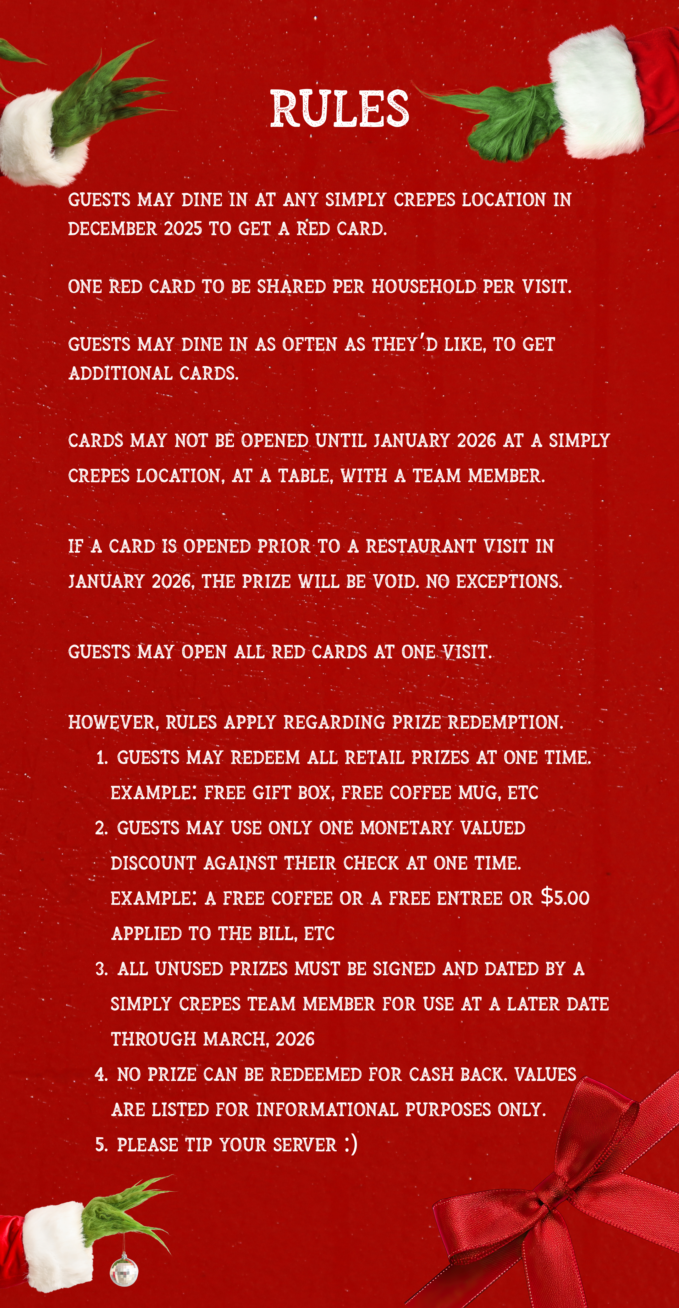 … but do not open the envelope! bring all your red cards back to Simply Crepes any time in January to reveal your prizes